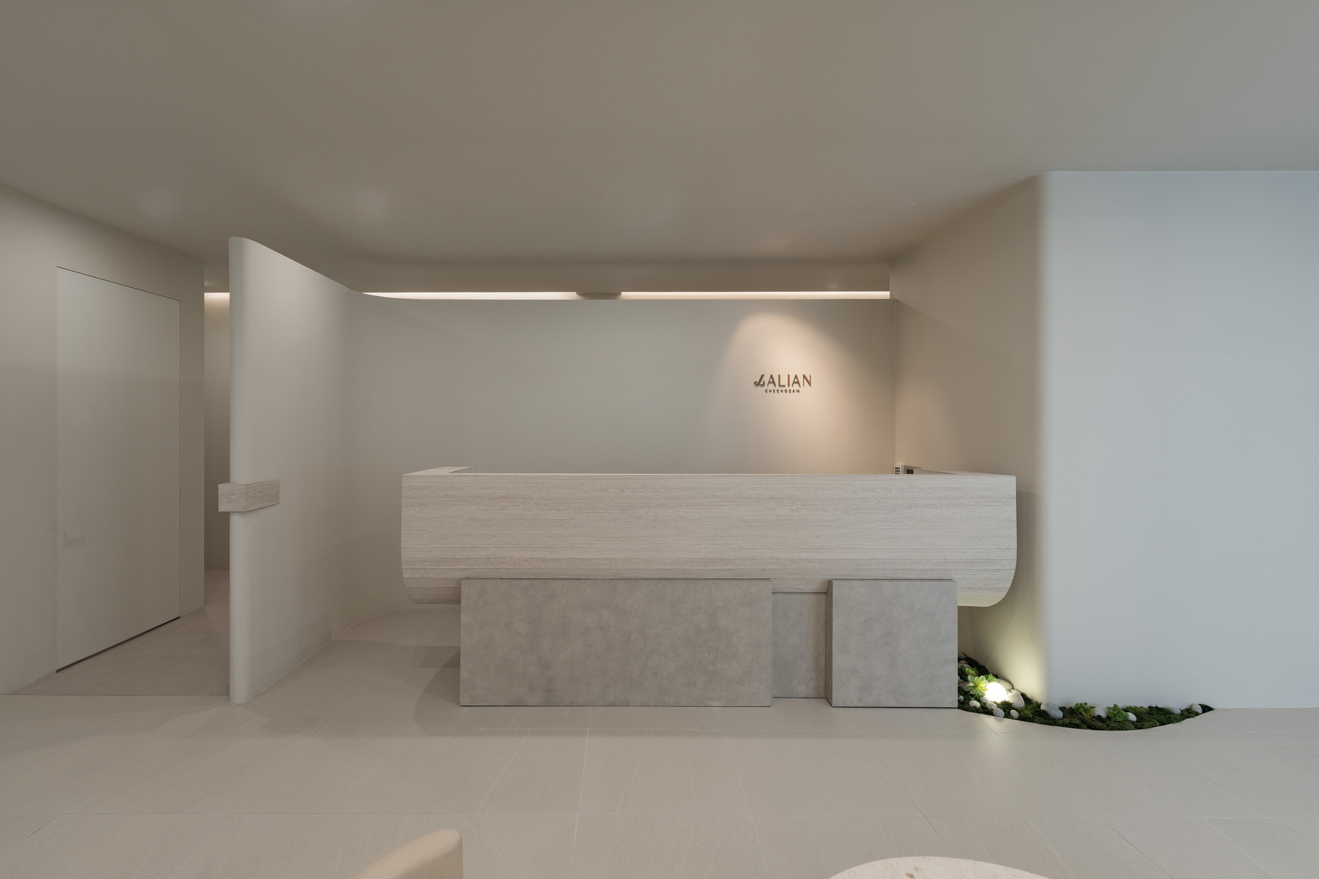 또한 자연광이 잘 드는 대기 공간은 긴장감을 낮추고 편안한 분위기를 유도한다. 입구 간판 역시 돌의 질감으로 마감하여 도심 속 세련됨을 자연스럽게 끌어안았다.